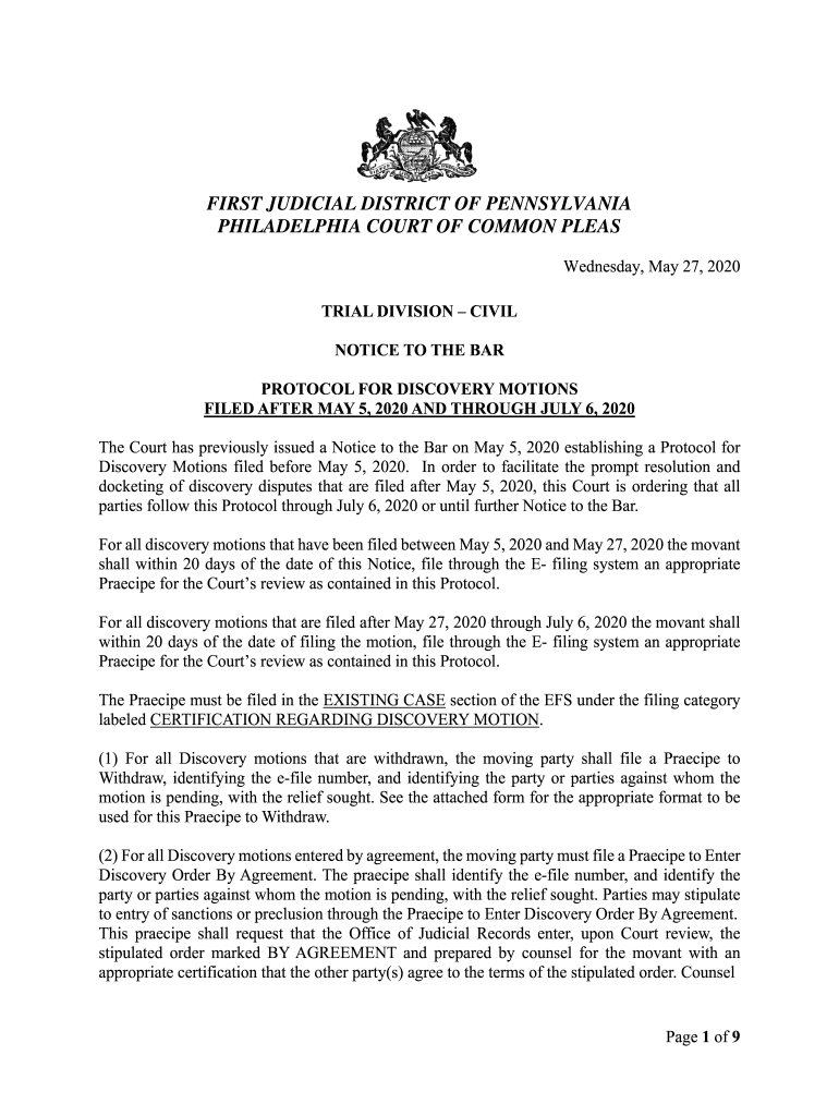 FIRST JUDICIAL DISTRICT OF PENNSYLVANIA PHILADELPHIA COURT OF COMMON PLEAS Wednesday, May 27, 2020, TRIAL DIVISION CIVIL NOTICE TO THE BAR PROTOCOL FOR DISCOVERY MOTIONS FILED AFTER MAY 5, 2020, AND