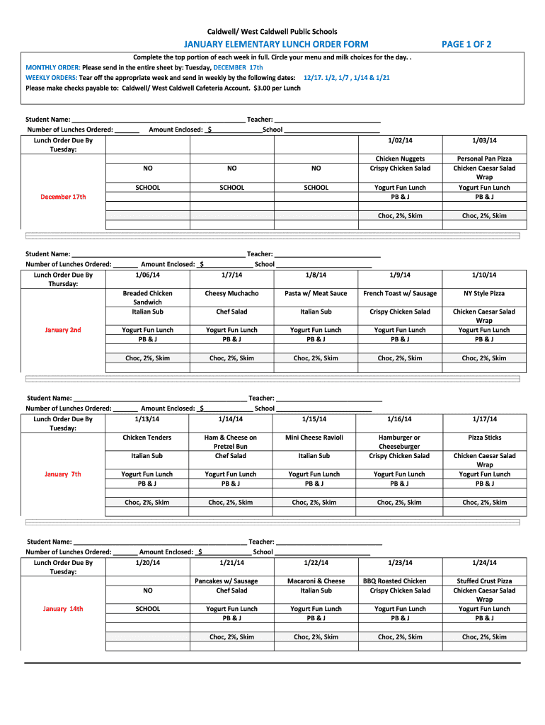 The January Elementary Lunch Order Form is an educational document used by students in Caldwell/West Caldwell Public Schools to order their lunches for January.