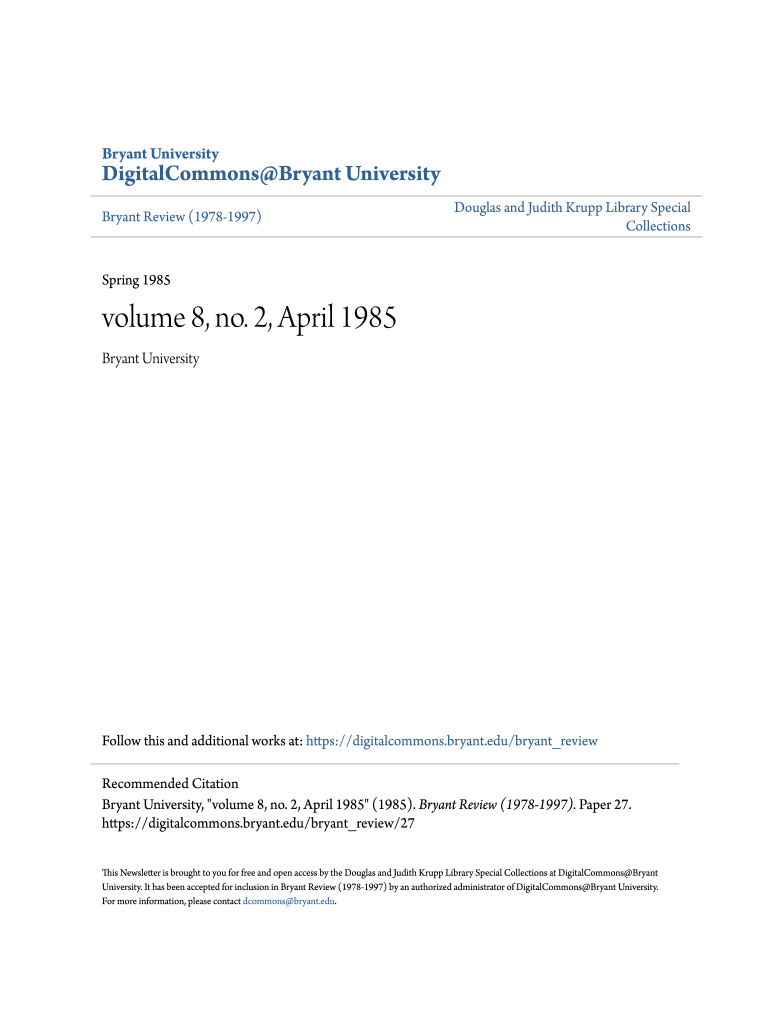 Bryant UniversityDigitalCommons Bryant University Bryant Review (19781997)Douglas and Judith Krupp Library Special CollectionsSpring 1985volume 8, no. 2, April 1985 Bryant UniversityFollow this and