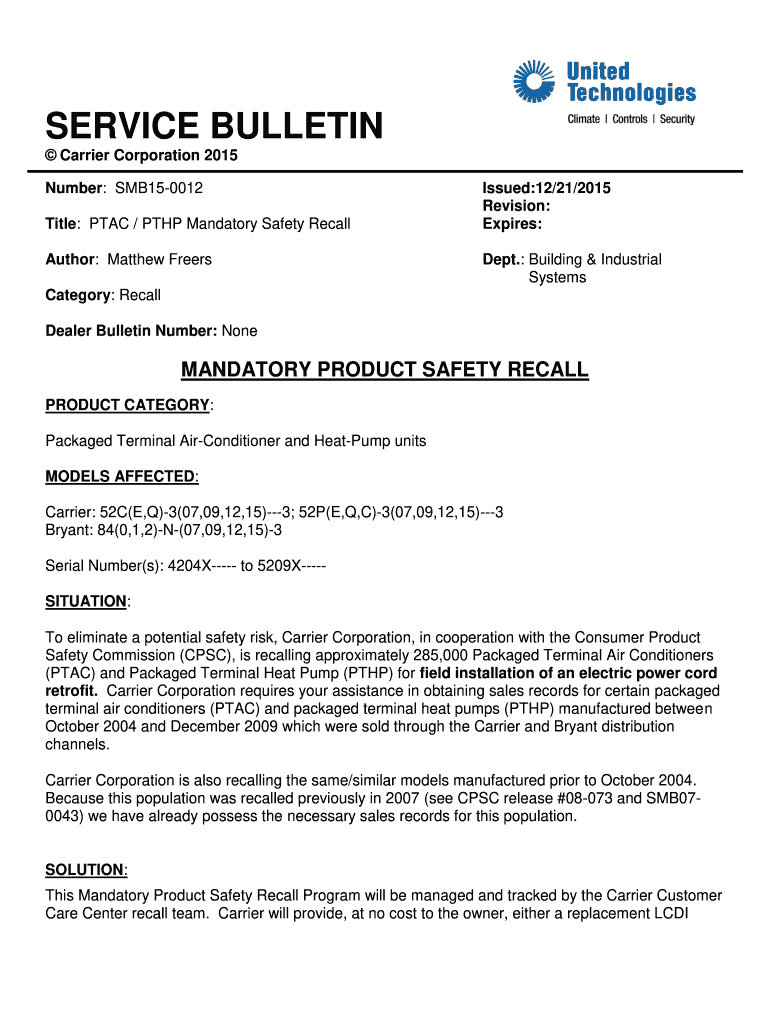 SERVICE BULLETIN Carrier Corporation 2015 Number: SMB150012 Title: PAC / PTH Mandatory Safety Recall Author: Matthew FreersIssued:12/21/2015 Revision: Expires: Dept.: Building & Industrial SystemsCategory: