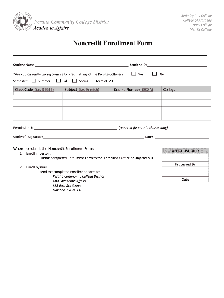 Berkeley City College of Alameda Lana College Merritt CollegePeralta Community College District Ac Academic AffairsNoncredit Enrollment Form Student Name: Student ID: *Are you currently taking courses
