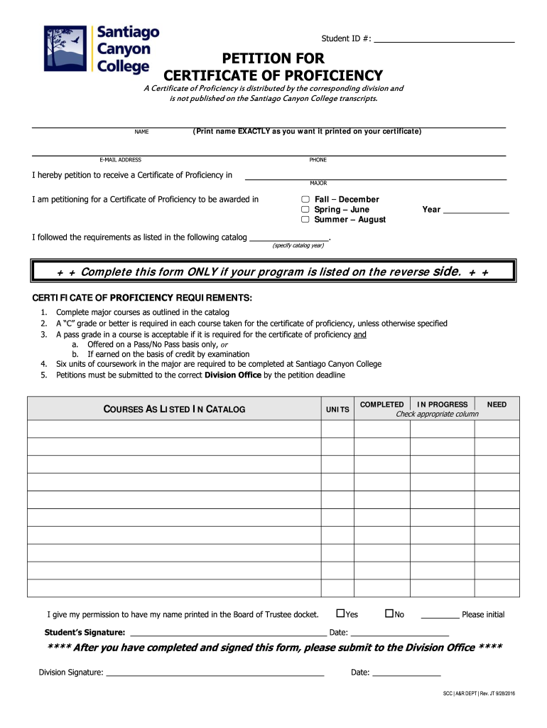 Student ID #:PETITION FOR CERTIFICATE OF PROFICIENCY Certificate of Proficiency is distributed by the corresponding division and is not published on the Santiago Canyon College transcripts.NAME(Print