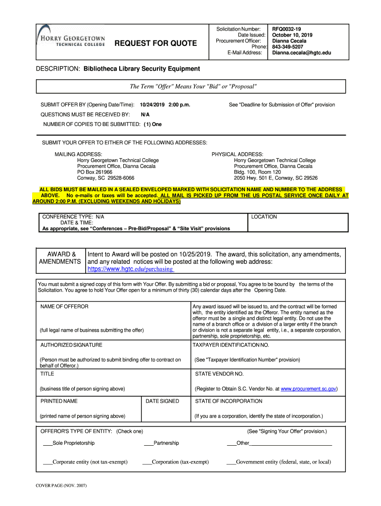 REQUEST FOR QUOTESolicitation Number: RFQ003219 Date Issued: October 10, 2019, Procurement Officer: Dianna Cecal Phone: 8433495207 Email Address: Dianna. Cecal HGNC.description: Bibliotheca Library