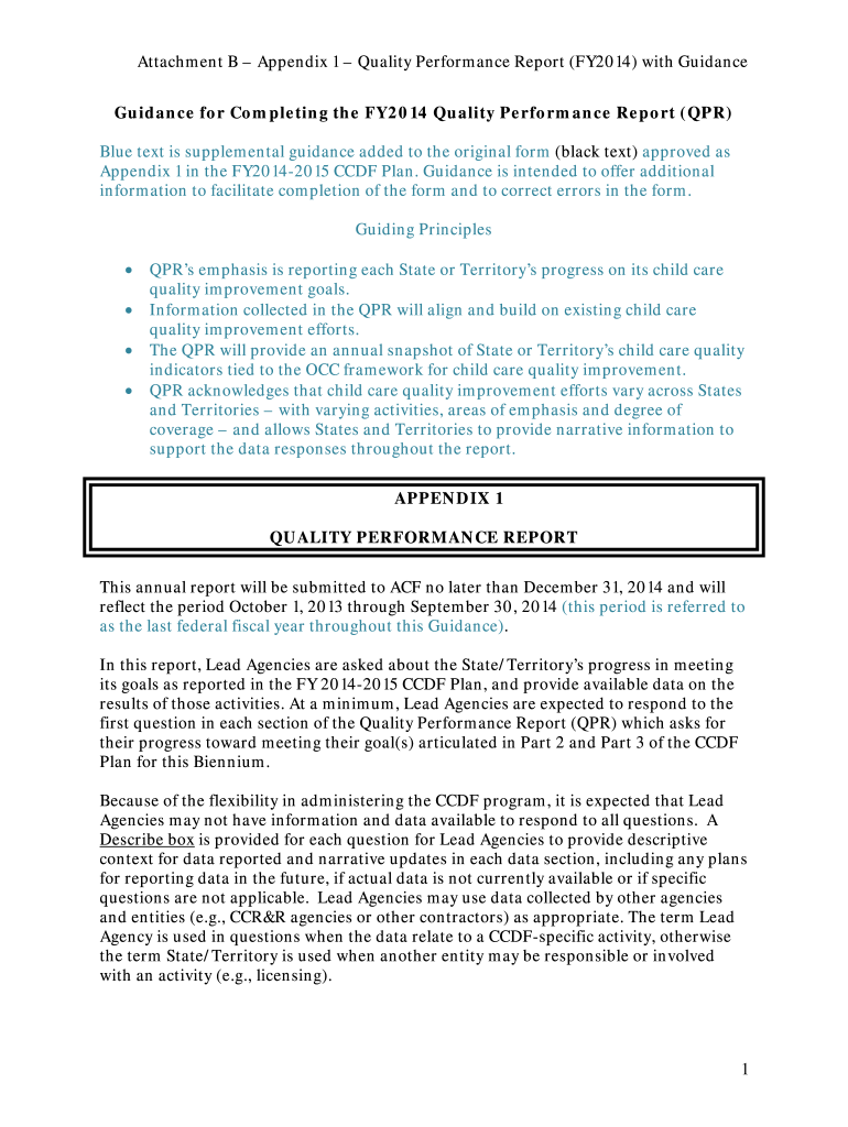 Attachment B Appendix 1 Quality Performance Report (FY2014) with Guidance for Completing the FY2014 Quality Performance Report (PR) Blue text is supplemental guidance added to the original form (black
