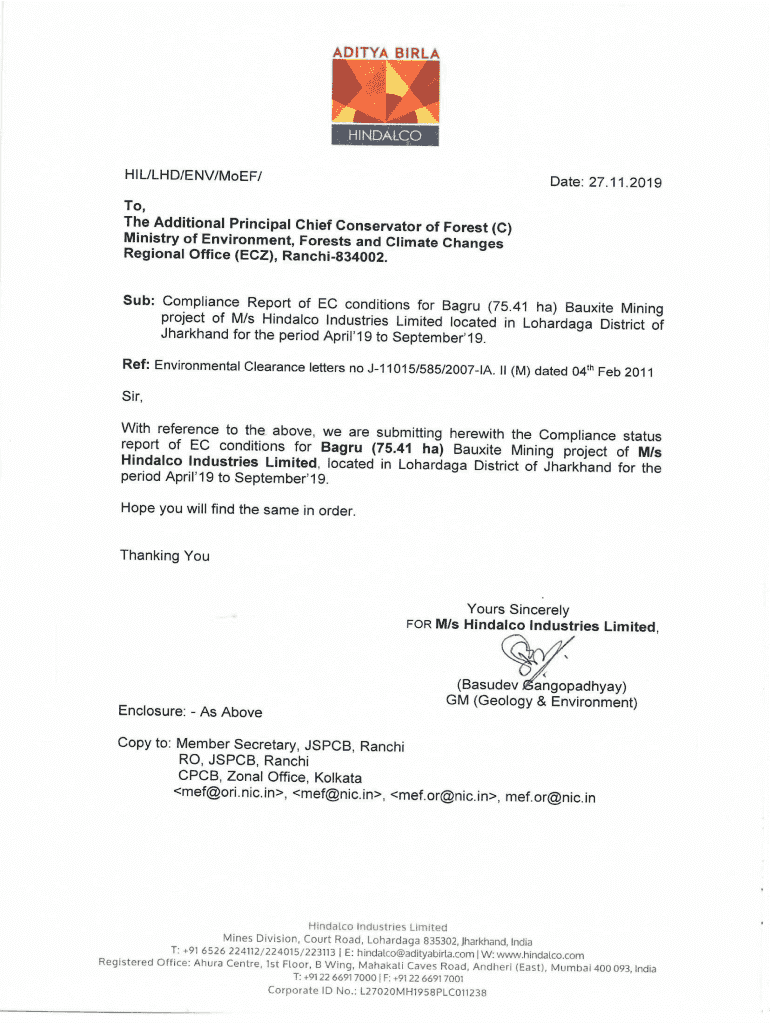 Compliance of conditions laid down in Environmental Clearance BA GRU BAUXITE MINES (75.41 Ha) Period: April19 to September19 MEF Environment Clearance ref. No. J 11015/585/2007 IA.II (M) dated 04