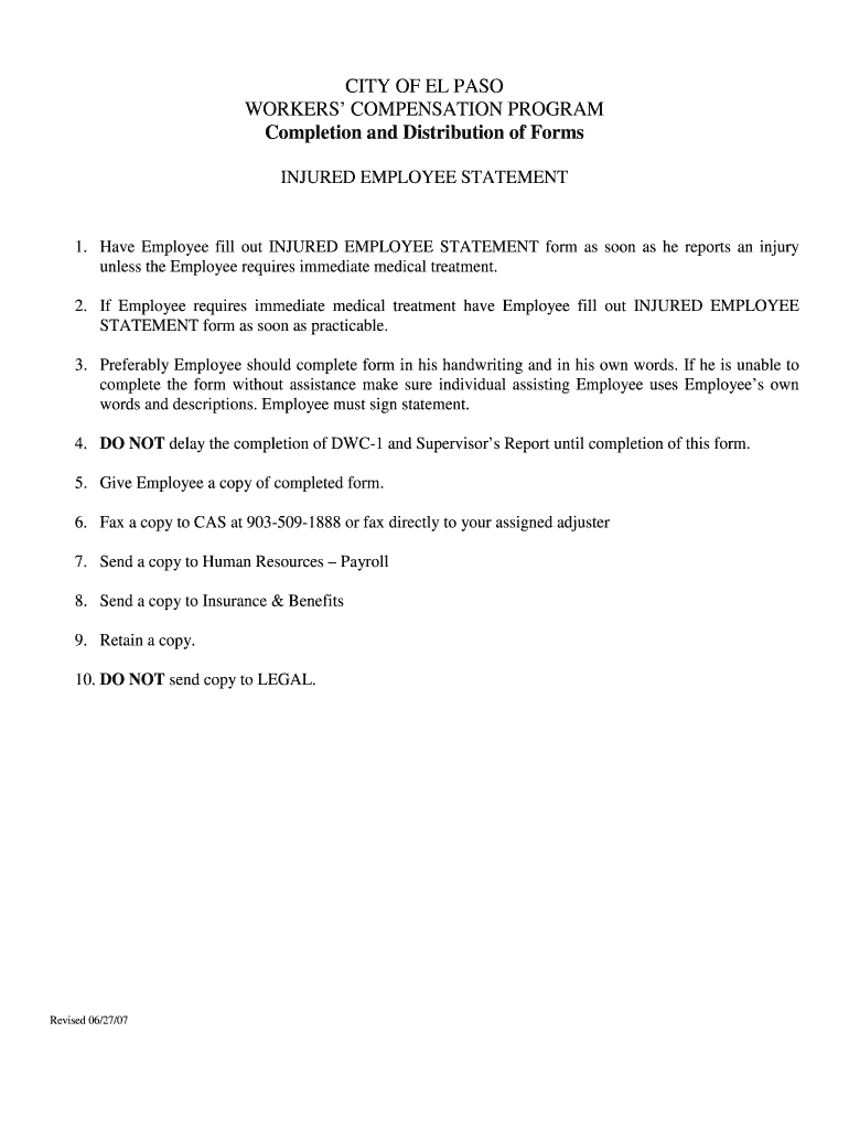 INJURED EMPLOYEE STATEMENT1. Have Employee fill out INJURED EMPLOYEE STATEMENT form as soon as he reports an injury