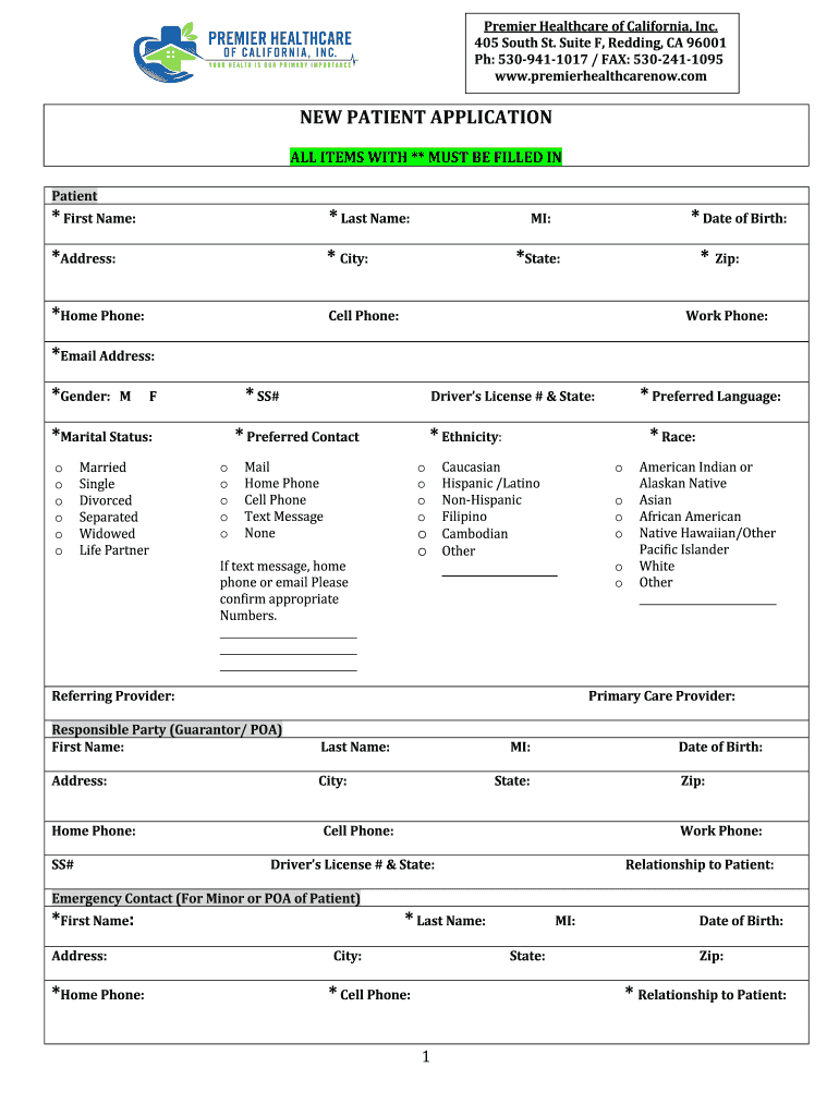 Premier Healthcare of California, Inc.405 South St. Suite F, Redding, CA 96001Ph: 5309411017 / FAX: 5302411095www.premierhealthcarenow.come PATIENT APPLICATION ALL ITEMS WITH ** MUST BE FILLED Inpatient* First Name:* Last Name:MI:* Date of Birth:*Address:* City: