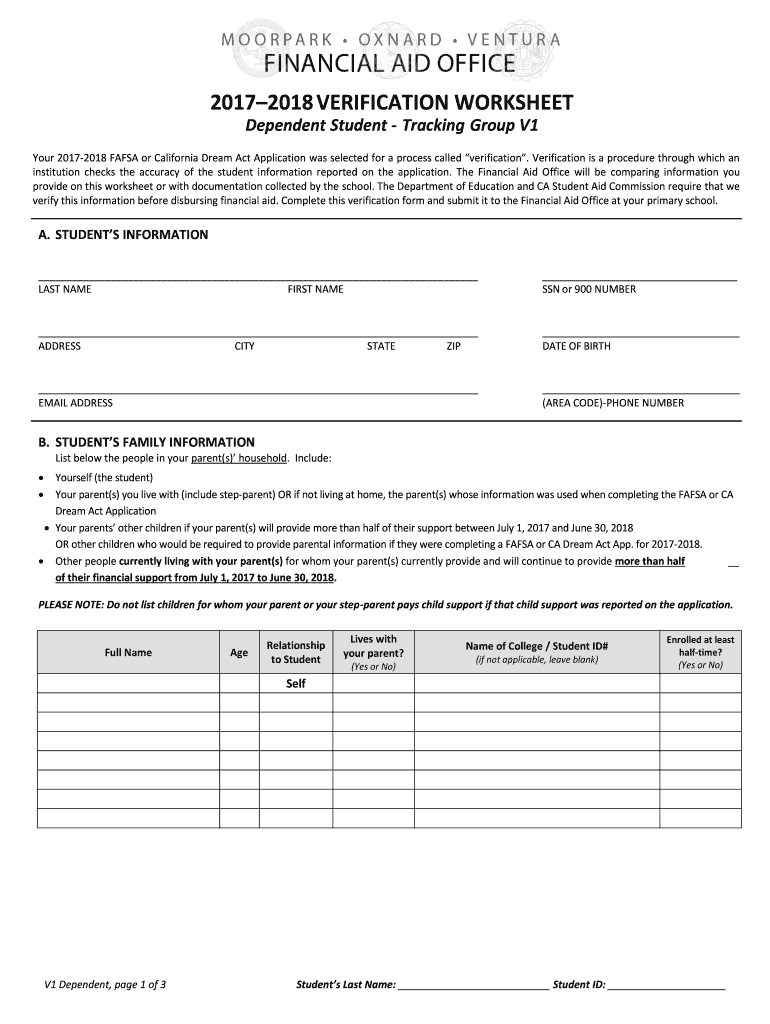 20172018 VERIFICATION WORKSHEET Dependent Student Tracking Group V1 Your 20172018 FAFSA or California Dream Act Application was selected for a process called verification. Verification is a procedure