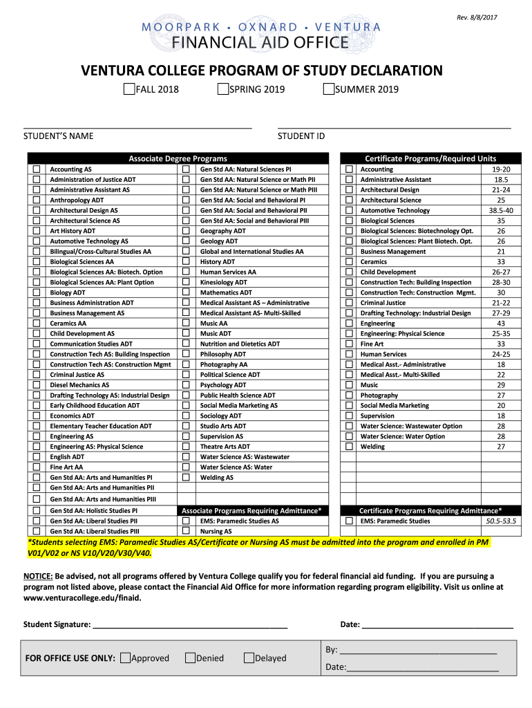 Rev. 8/8/2017VENTURA COLLEGE PROGRAM OF STUDY DECLARATION FALL 2018SPRING 2019 STUDENTS NAME STUDENT Associate Degree Programs Accounting AS Administration of Justice ADT Administrative Assistant