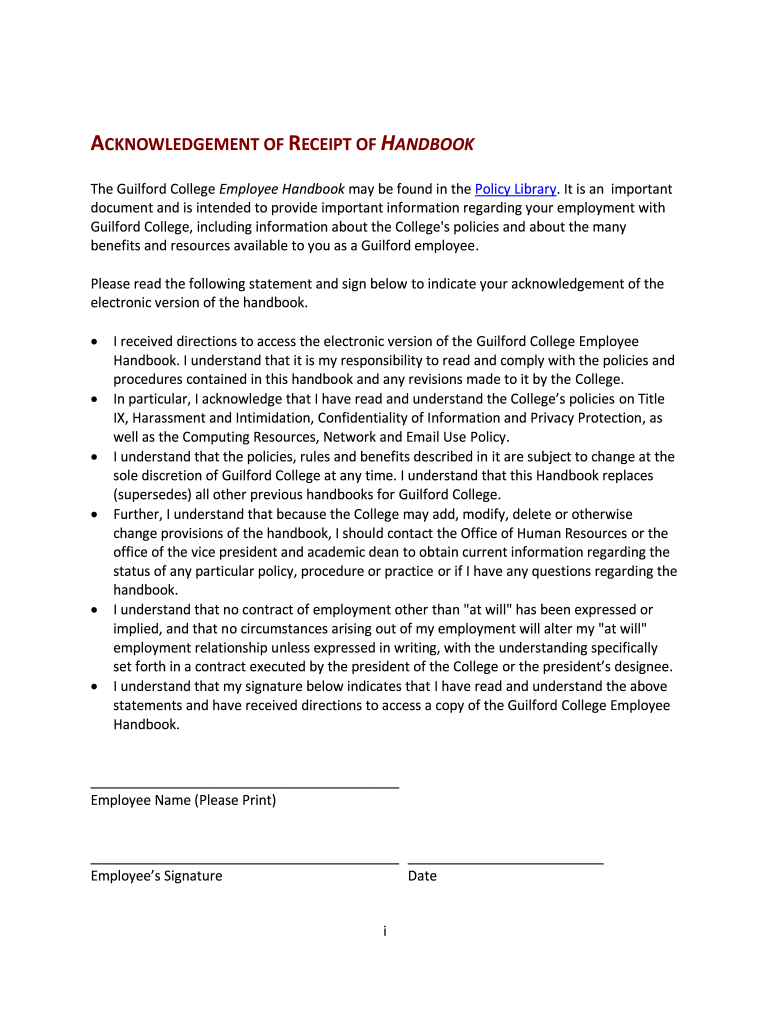The Guilford College Employee Handbook may be found in the Policy Library. It is an important