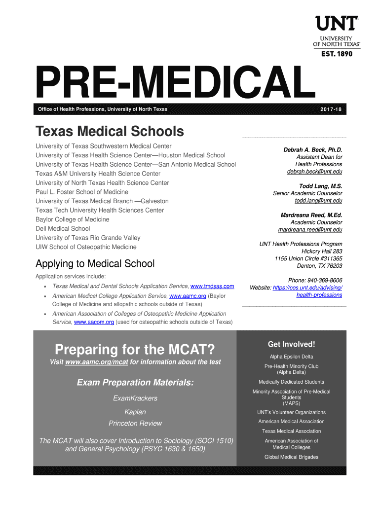 PREMEDICAL Office of Health Professions, University of North Texas201718Texas Medical Schools University of Texas Southwestern Medical Center University of Texas Health Science Center Houston Medical