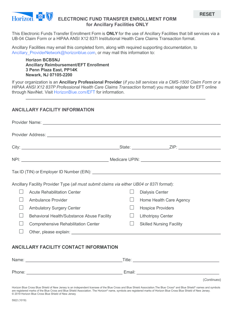 for Ancillary Facilities ONLYRESETThis Electronic Funds Transfer Enrollment Form is ONLY for the use of Ancillary Facilities that bill services via a