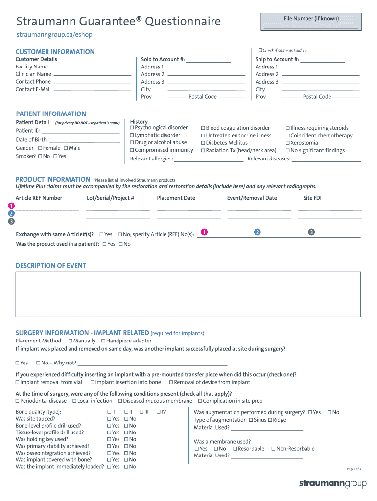 Trauma Guarantee QuestionnaireFile Number (if known) straumanngroup.ca/eshop CUSTOMER INFORMATIONCheck if same as Sold Customer Details Facility Name Clinician Name Contact Phone Contact Email PATIENT