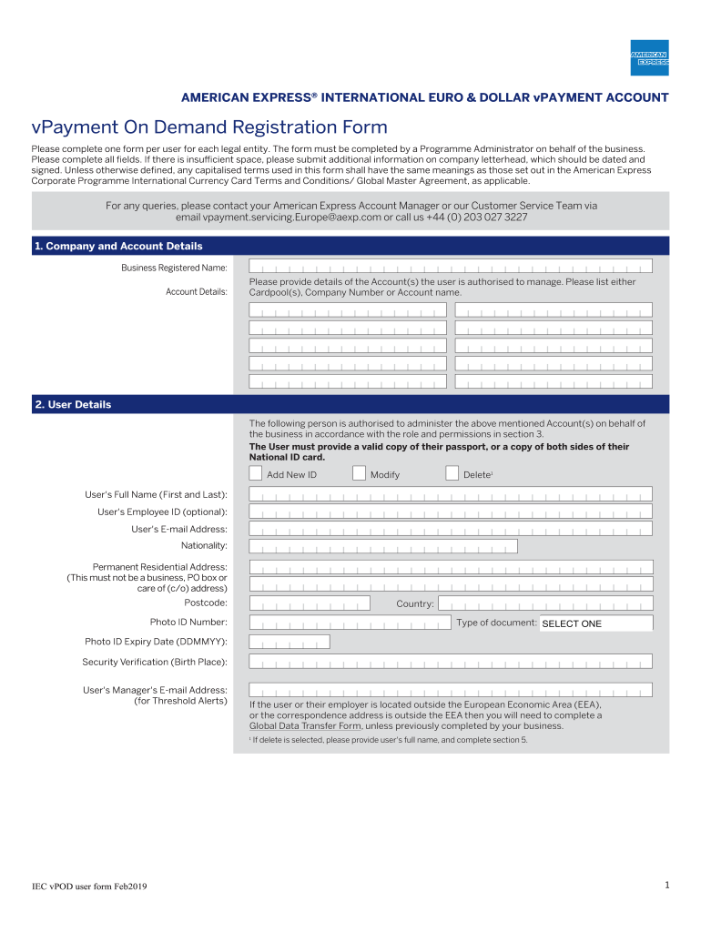CLEARPRINTAMERICAN EXPRESS INTERNATIONAL EURO & DOLLAR payment ACCOUNTvPayment On Demand Registration Form Please complete one form per user for each legal entity. The form must be completed by a