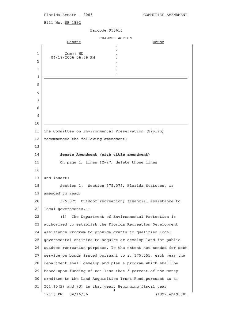 Florida Senate 2006COMMITTEE AMENDMENT Bill No. SB 1892 Barcode 950616 CHAMBER ACTION Senate1 2 3 4House. . Comm: WD. 04/18/2006 06:36 PM. . . . . 5 6 7 8 9 10 11The Committee on Environmental Preservation