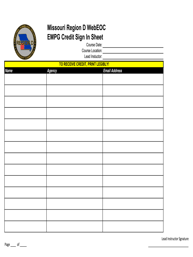 Missouri Region D Weber EPG Credit Sign In Sheet Course Date: Course Location: Lead Instructor: Name Page of Agency TO RECEIVE CREDIT, PRINT LEGIBLY! Email AddressLeadInstructorSgnature.