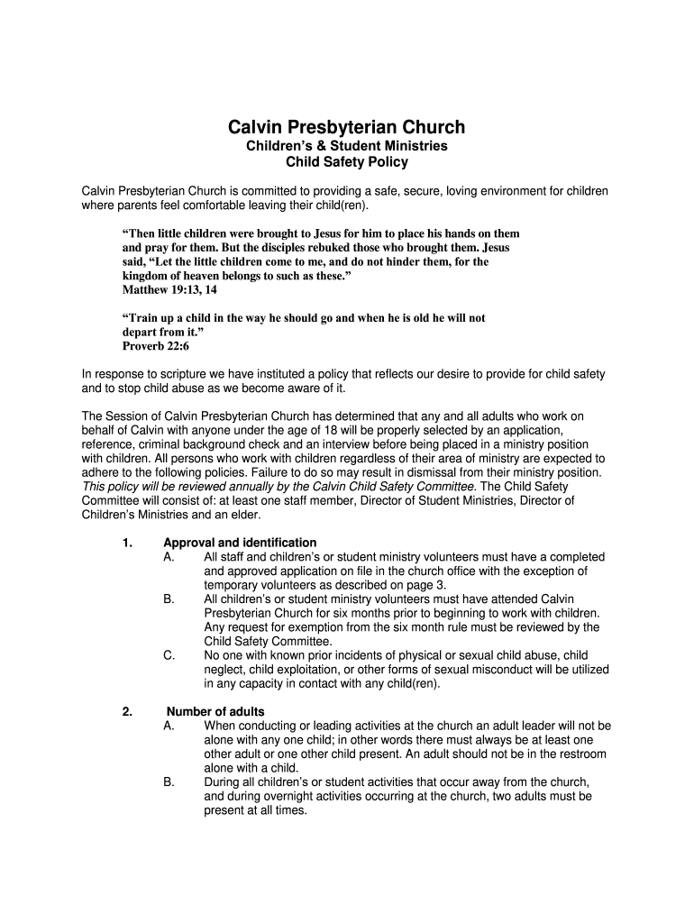Calvin Presbyterian Church Children's & Student Ministries Child Safety Policy Calvin Presbyterian Church is committed to providing a safe, secure, loving environment for children where parents feel