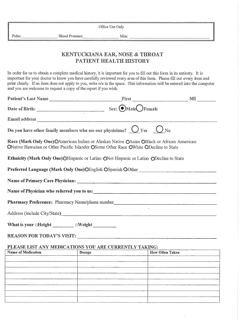 Office Use Only Pulse Blood Pressure Misc. KENTUCKIANS EAR, NOSE & THROAT PATIENT HEALTH HISTORY In order for us to obtain a complete medical history, it is important for you to fill out this form