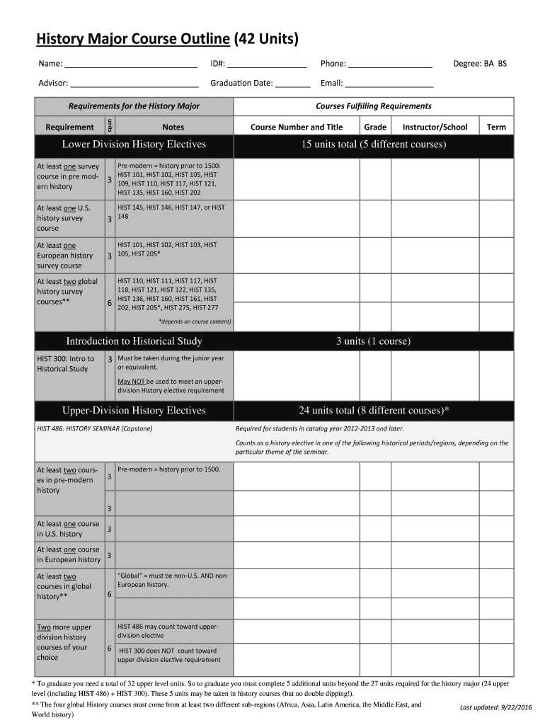 Remember to follow any specific guidelines or requirements provided by your institution while filling out the history major course outline.