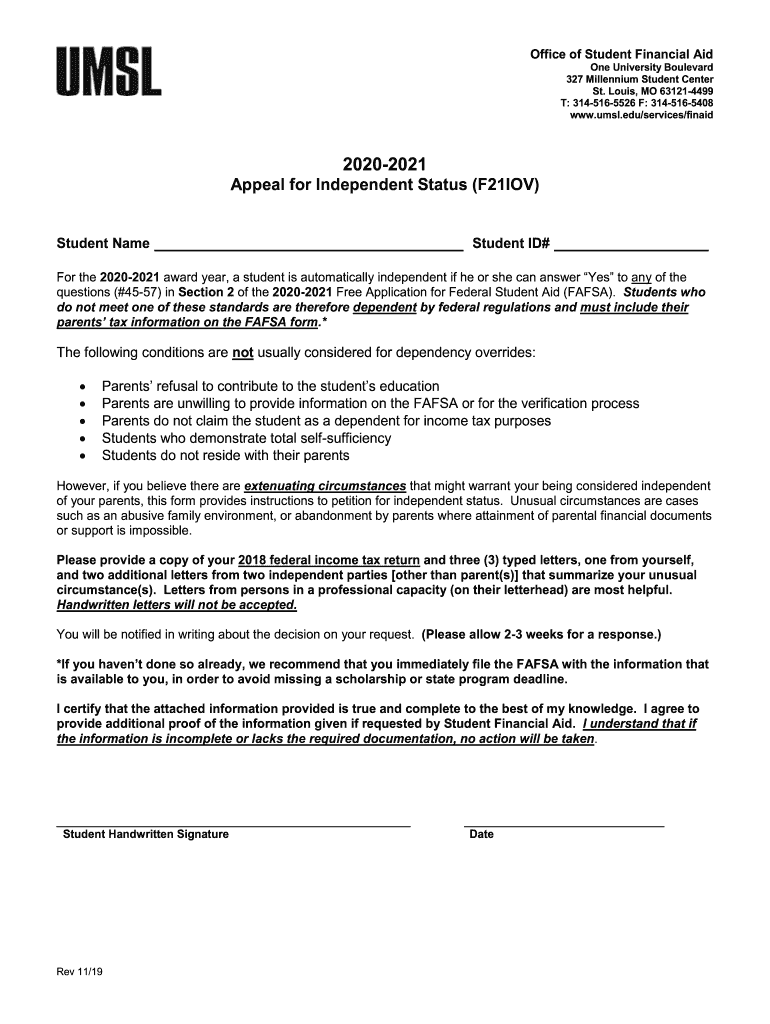 Office of Student Financial Alone University Boulevard 327 Millennium Student Center St. Louis, MO 631214499 T: 3145165526 F: 3145165408 www.umsl.edu/services/finaid20202021Appeal for Independent