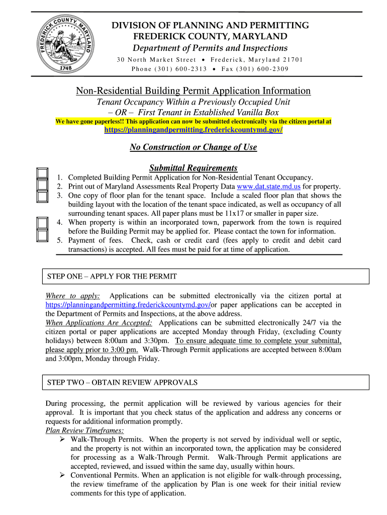 DIVISION OF PLANNING AND PERMITTING FREDERICK COUNTY, MARYLAND Department of Permits and Inspections 30 North Market Street Frederick, Maryland 21701 Phone (301) 6002313 Fax (301) 6002309NonResidential