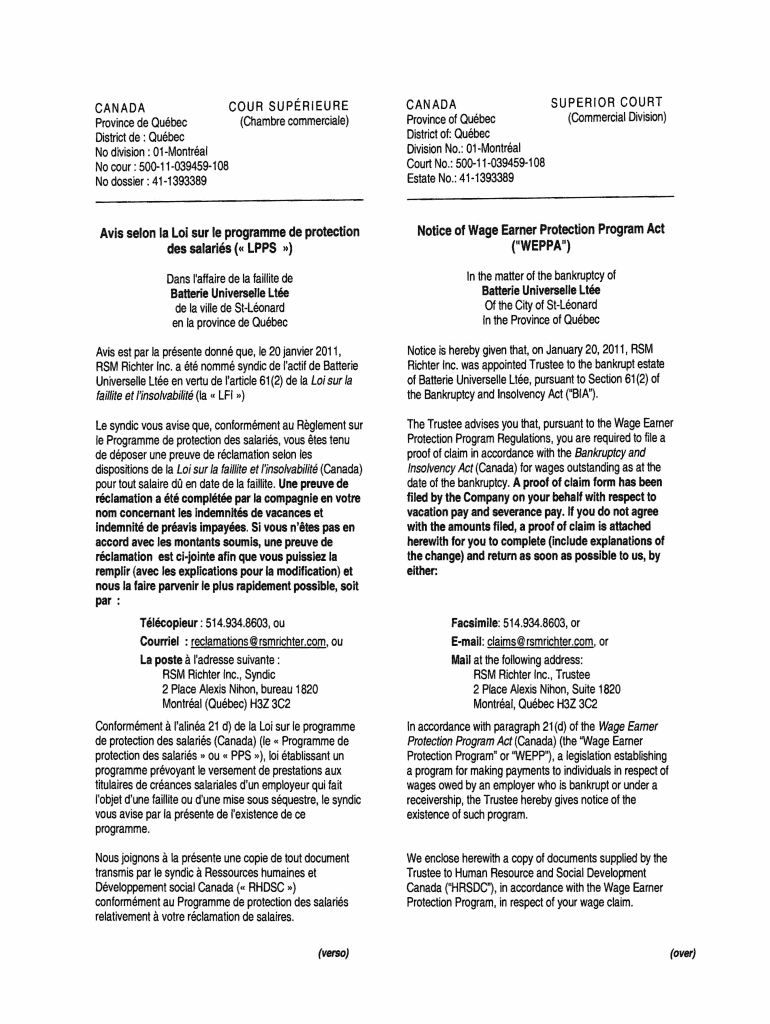 FOUR SUPERIOR CANADA (Chamber commercial) Province Quebec District DE: Quebec No division: 01Montreal No four : 50011039459108 No dossier: 411393389SUPERIOR COURT CANADA (Commercial Division) Province