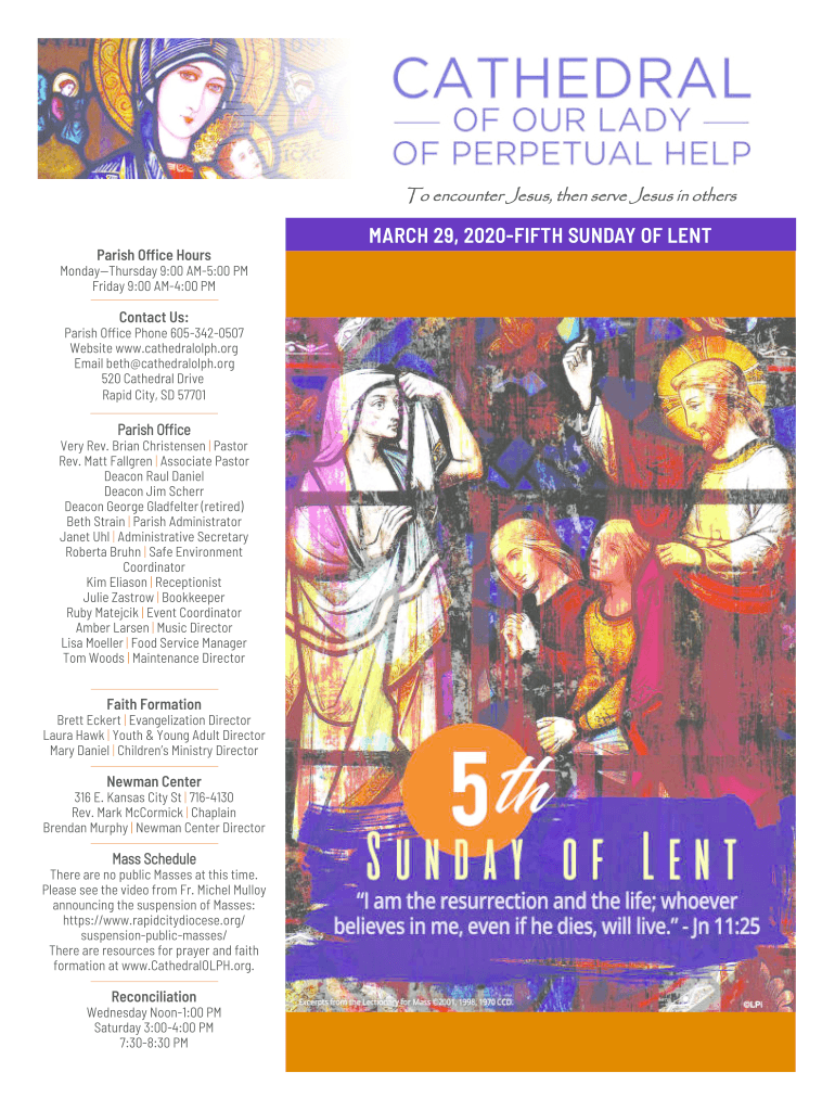 To encounter Jesus, then serve Jesus in others Parish O!CE HoursMondayThursday 9:00 AM5:00 PM Friday 9:00 AM4:00 Contact Us:Parish O!CE Phone 6053420507 Website www.cathedralolph.org Email Beth cathedralolph.org