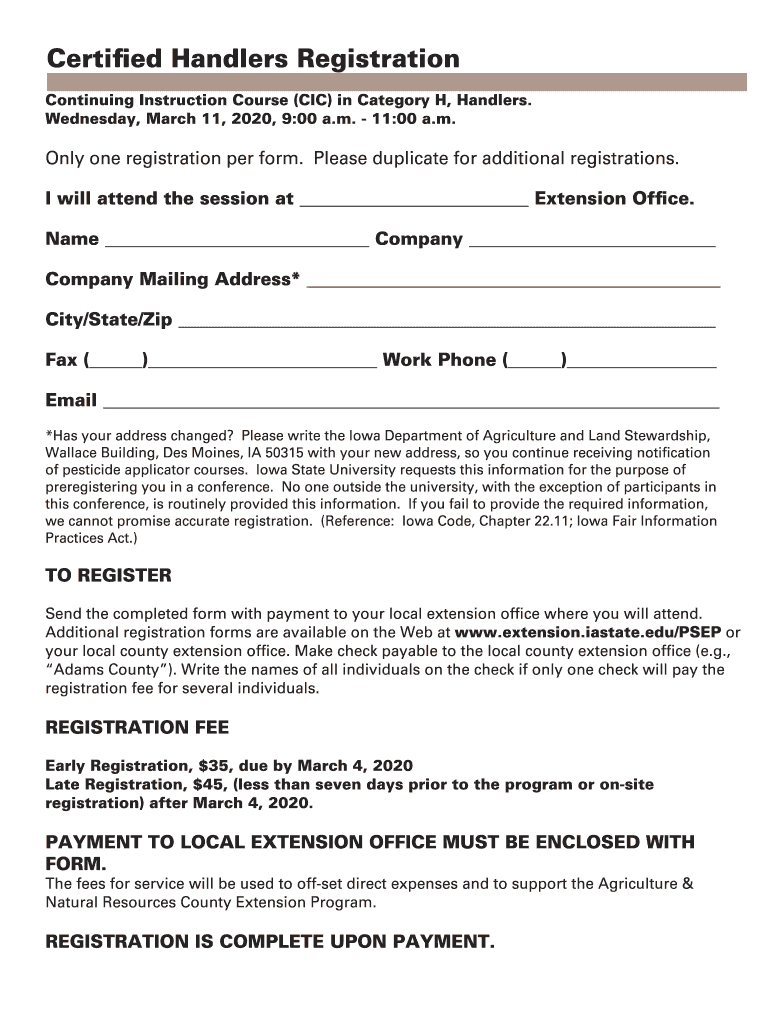 Certified Handlers Registration Continuing Instruction Course (CIC) in Category H, Handlers. Wednesday, March 11, 2020, 9:00 a.m. 11:00 a.m. Only one registration per form. Please duplicate for additional