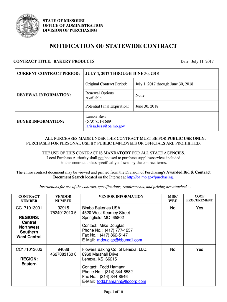 DIVISION OF PURCHASINGNOTIFICATION OF STATEWIDE CONTRACT TITLE: BAKERY PRODUCTS