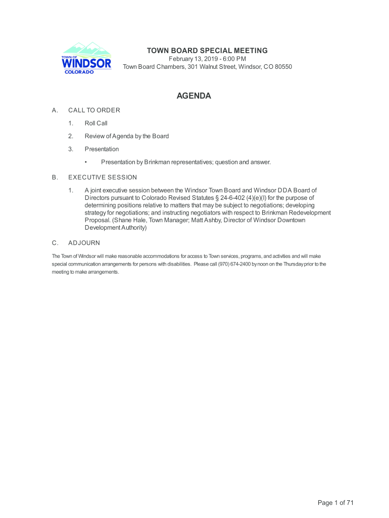 TOWN BOARD SPECIAL MEETING February 13, 2019 6:00 PM Town Board Chambers, 301 Walnut Street, Windsor, CO 80550AGENDA A.CALL TO ORDER 1. Roll Call2. Review of Agenda by the Board3. Presentation B.EXECUTIVE