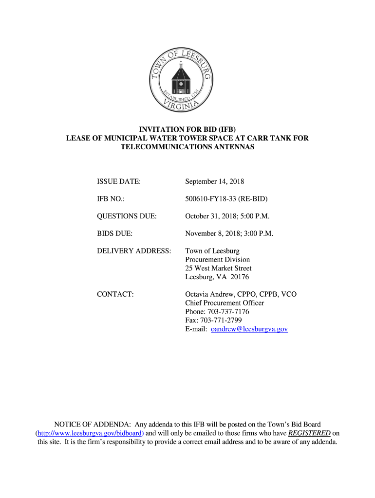 TELECOMMUNICATIONS ANTENNASISSUE DATE:September 14, 2018IFB NO.:500610FY1833 (REBID)QUESTIONS DUE:October 31, 2018; 5:00