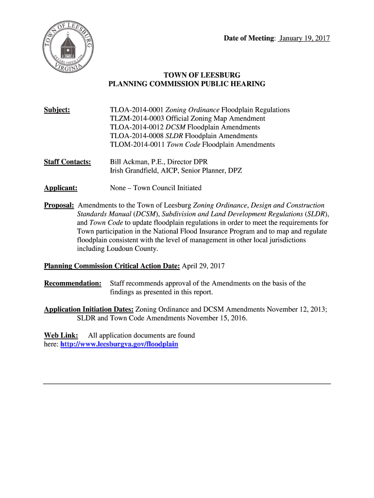Date of Meeting: January 19, 2017TOWN OF LEESBURG PLANNING COMMISSION PUBLIC HEARINGSubject:TLOA20140001 Zoning Ordinance Floodplain Regulations TLZM20140003 Official Zoning Map Amendment TLOA20140012