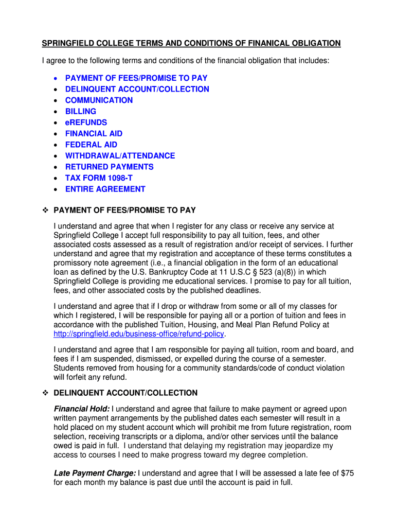 SPRINGFIELD COLLEGE TERMS AND CONDITIONS OF FINANCIAL OBLIGATION I agree to the following terms and conditions of the financial obligation that includes: PAYMENT OF FEES/PROMISE TO PAY DELINQUENT