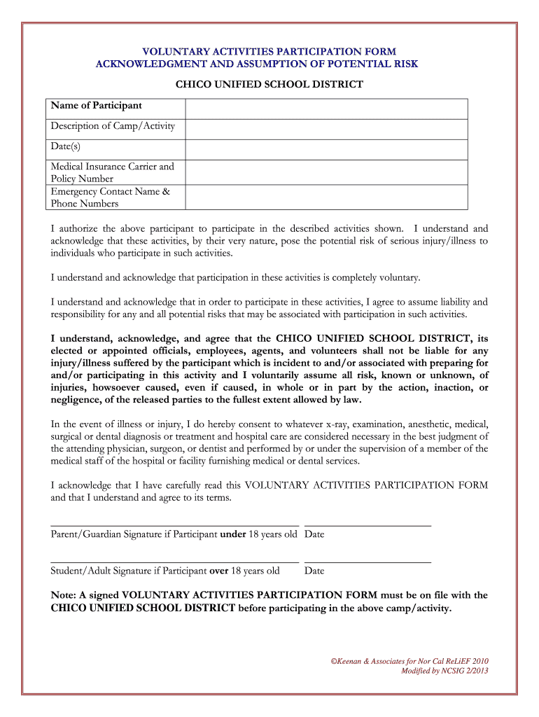 VOLUNTARY ACTIVITIES PARTICIPATION FORM ACKNOWLEDGMENT AND ASSUMPTION OF POTENTIAL RISK CHICO UNIFIED SCHOOL DISTRICT Name of Participant Description of Camp/Activity Date(s) Medical Insurance Carrier