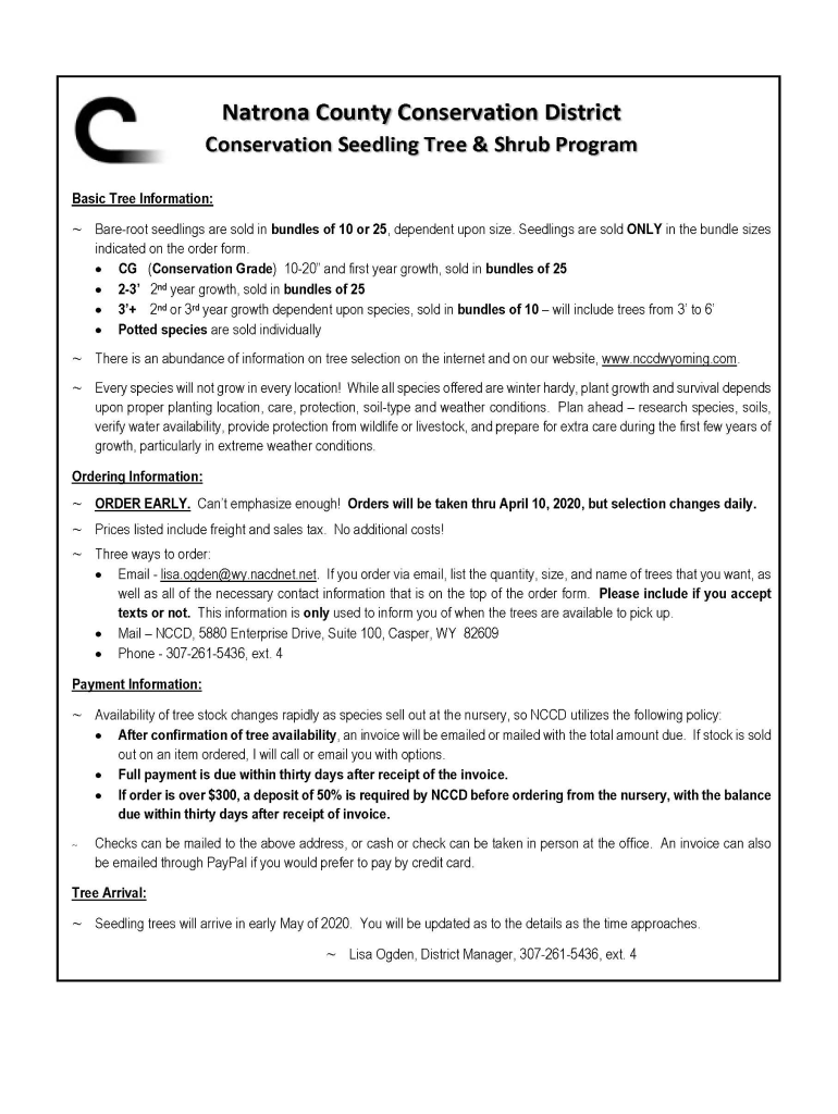 Natron County Conservation District Seedling Tree and Shrub 20192020 Order Formulated 10/1/2019First Name:5880 Enterprise Drive, Suite 100 Casper, Wyoming 82609 3072615436, ext. 4Last Name:Physical