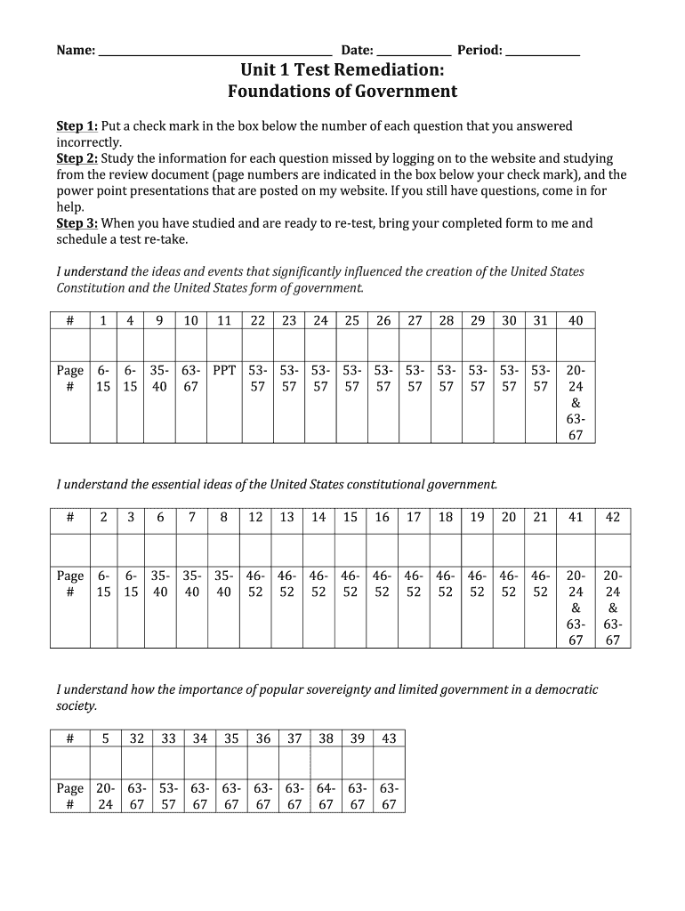 Name: Date: Period: Unit1TestRemediation: FoundationsofGovernment Step1:Putacheckmarkintheboxbelowthenumberofeachquestionthatyouanswered incorrectly. Step2:Studytheinformationforeachquestionmissedbyloggingontothewebsiteandstudying