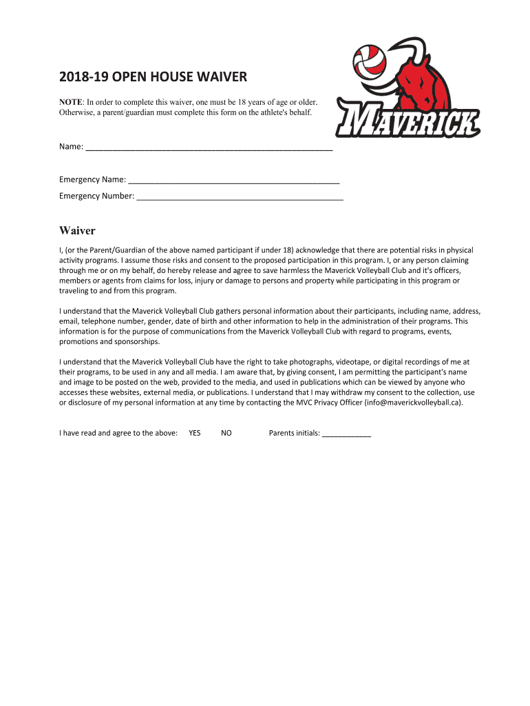 201819 OPEN HOUSE WAIVER NOTE: In order to complete this waiver, one must be 18 years of age or older. Otherwise, a parent/guardian must complete this form on the athlete's behalf. Name: Emergency