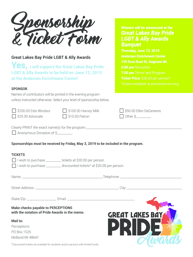 Sponsorship & Ticket Format Lakes Bay Pride LGBT & Ally Awardees, I will support the Great Lakes Bay Pride LGBT & Ally Awards to be held on June 13, 2019, at the Andersen Enrichment Center! Winners