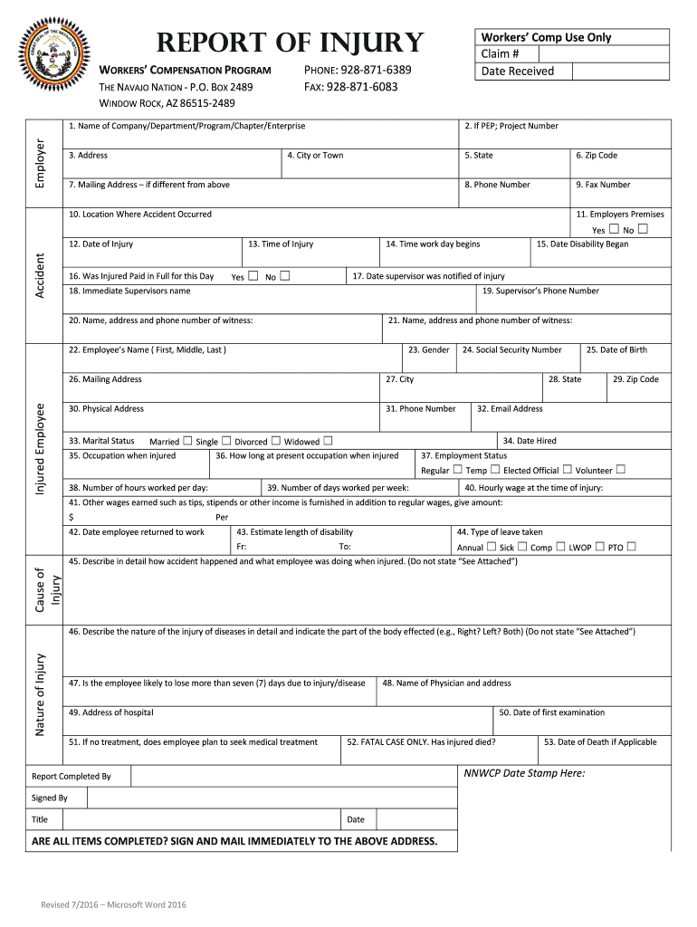 REPORT OF INJURY WORKERS COMPENSATION PROGRAMPHONE: 9288716389 FAX: 9288716083THE NAVAJO NATION P.O. BOX 2489 WINDOW ROCK, AZ 865152489EmployerWorkers Comp Use Only Claim # Date Received1. Name of