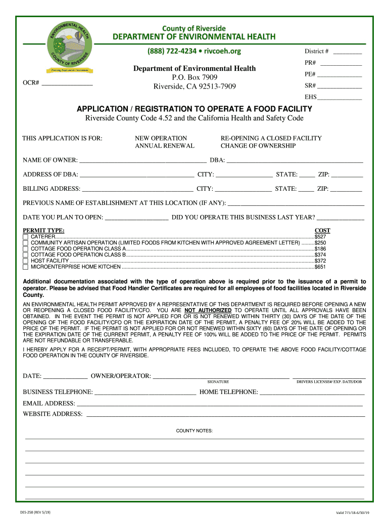 District # Department of Environmental Health P.O. Box 7909 Riverside, CA 925137909OCR# PR# PE# SR# EHS APPLICATION / REGISTRATION TO OPERATE A FOOD FACILITY Riverside County Code 4.52 and the California