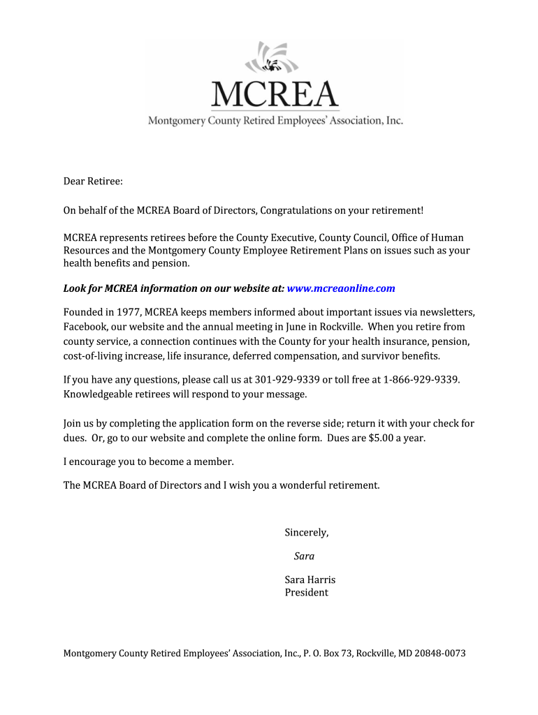 Dear Retiree:On behalf of the MC REA Board of Directors, Congratulations on your retirement!MC REA represents retirees before the County Executive, County Council, Office of Human
