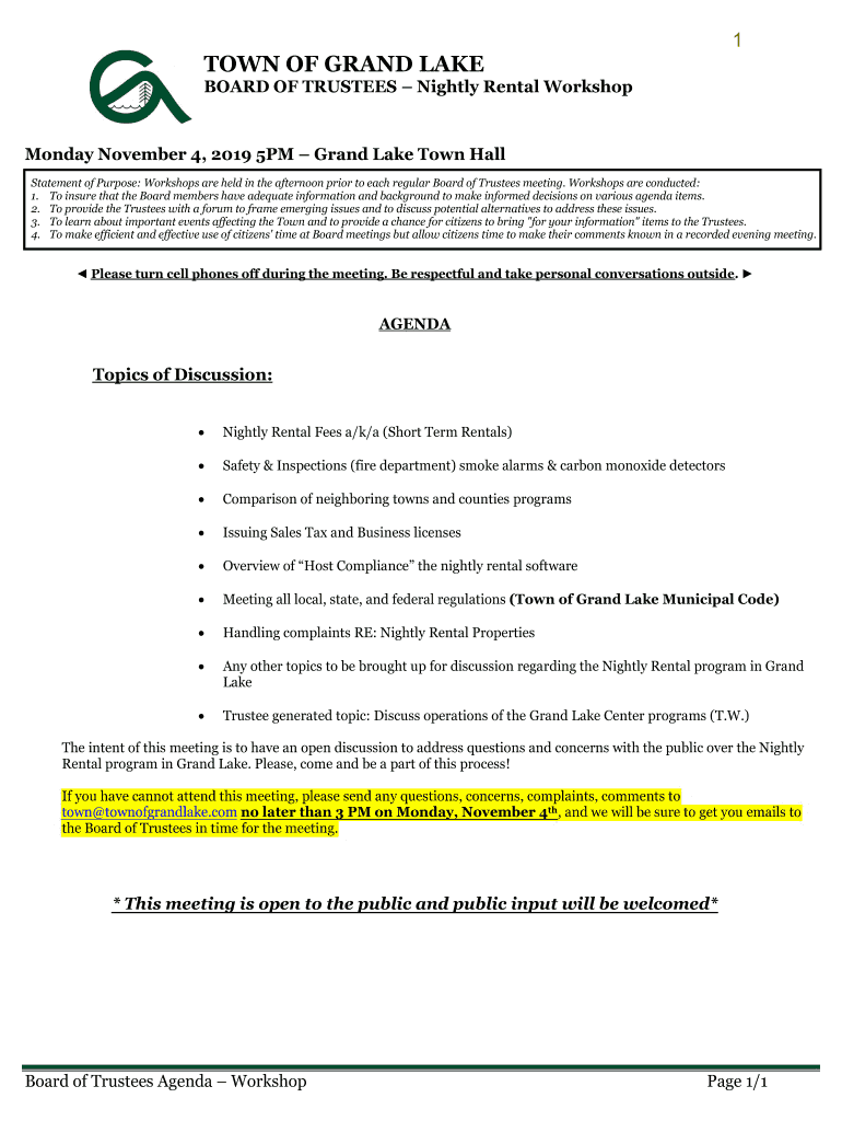 1TOWN OF GRAND BASEBOARD OF TRUSTEES Nightly Rental Workshop Monday, November 4, 2019 5PM Grand Lake Town Hall Statement of Purpose: Workshops are held in the afternoon prior to each regular Board
