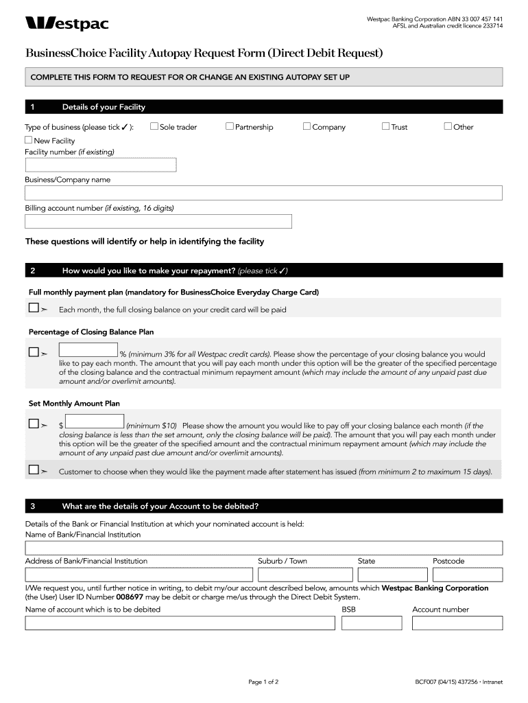 Westpac Banking Corporation ABN 33 007 457 141 ADSL and Australian credit license 233714BusinessChoice Facility Autopay Request Form (Direct Debit Request) COMPLETE THIS FORM TO REQUEST FOR OR CHANGE