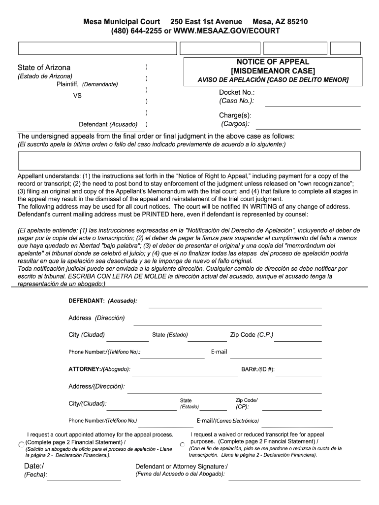 Mesa Municipal Court 250 East 1st Avenue Mesa, AZ 85210 (480) 6442255 or WWW.MESAAZ.GOV/ECOURTState of ArizonaNOTICE OF APPEAL MISDEMEANOR CASE)(Est ado de Arizona) Plaintiff, (Dem andante))AVIS ODE