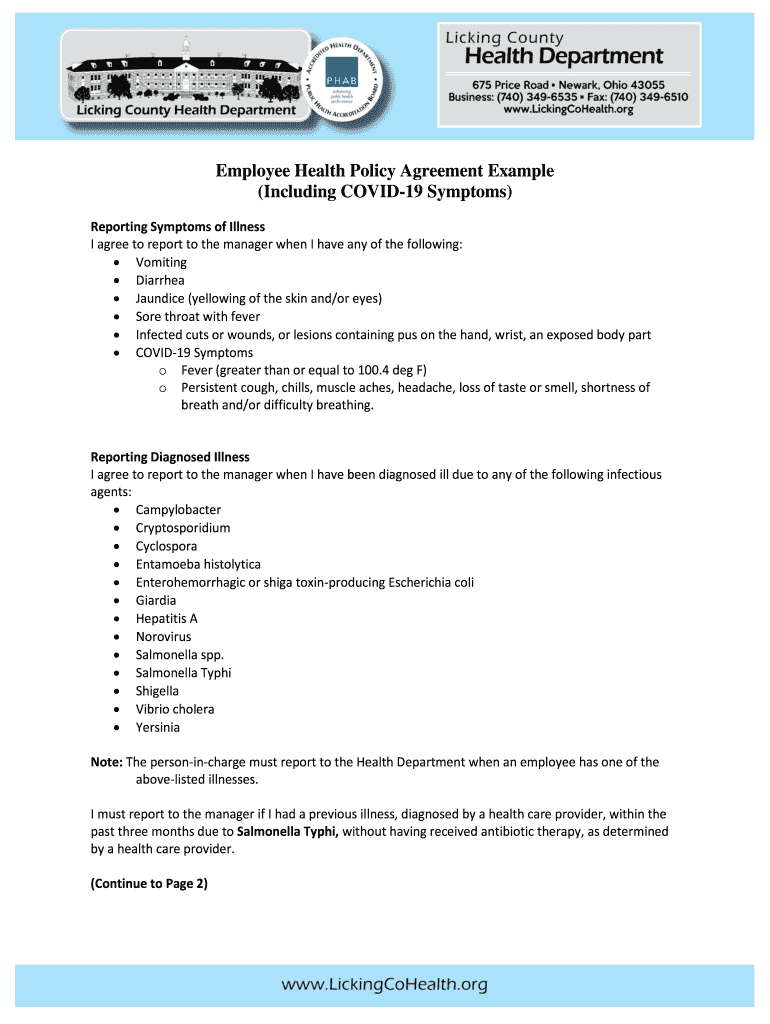 Employee Health Policy Agreement Example (Including COVID-19 Symptoms) Reporting Symptoms of Illness I agree to report to the manager when I have any of the following: Vomiting Diarrhea Jaundice (yellowing