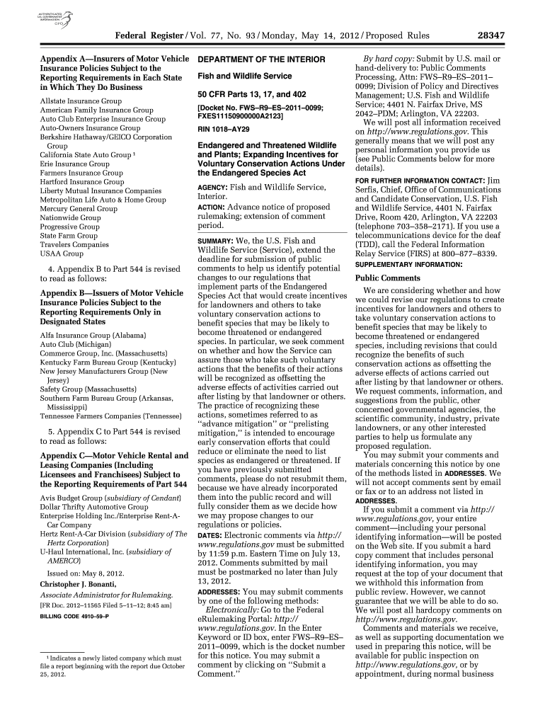 Get the free 93 / Monday, May 14, 2012 / Proposed Rules Appendix A Insurers of Motor Vehicle Insu...