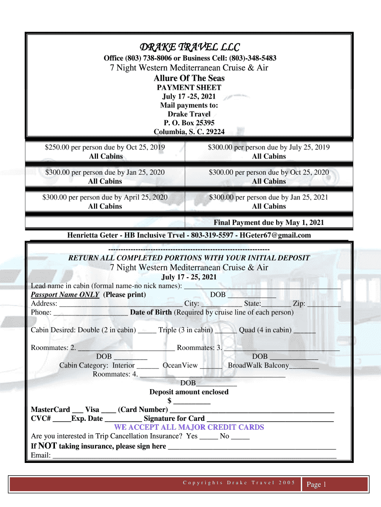 DRAKE TRAVEL LLC Office (803) 7388006 or Business Cell: (803)34854837 Night Western Mediterranean Cruise & Air Allure Of The Seas PAYMENT SHEET July 17 25, 2021 Mail payments to: Drake Travel P. O.