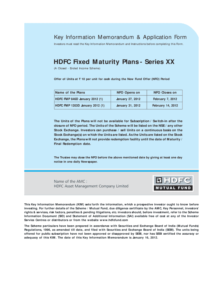 The HDFC Fixed Maturity Plans Application Form is a financial document used by investors to apply for units in HDFC's fixed maturity plans, enabling them to detail their investment objectives.