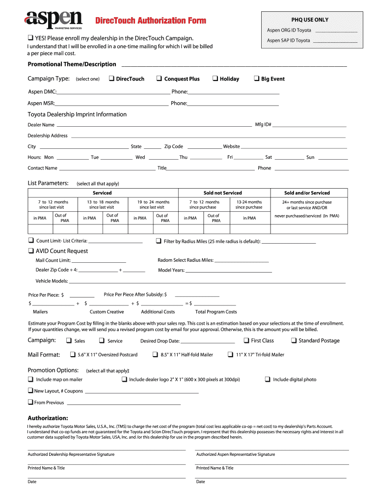 Direct ouch Authorization Form USE ONLY Aspen ORG ID Toyota YES! Please enroll my dealership in the Direct ouch Campaign. Aspen SAP ID Toyota I understand that I will be enrolled in a onetime mailing