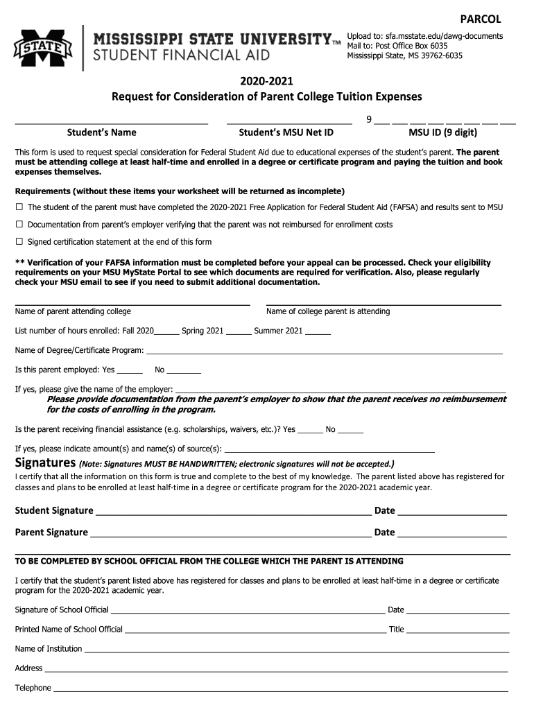 PARCEL Upload to: sfa.msstate.edu/dawgdocuments Mail to: Post Office Box 6035 Mississippi State, MS 39762603520202021 Request for Consideration of Parent College Tuition Expenses Students Name Students
